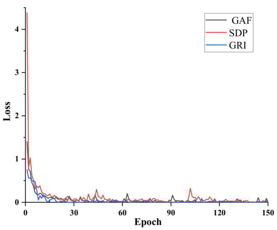 Qualitatively analyzed, the SDP method converts one-dimensional signal data into a two-dimensional polar coordinate system, and intuitively represents the characteristics of the signal in the form of images, showing a perceptual ability to associate local information with the global []. At the same time, in terms of image features, SDP transformed images are simpler and more prominent than GAF images and grayscale images, which is beneficial for subsequent neural network-based state recognition. In addition, in terms of the feature fluctuation in the same state, by analyzing a large number of transformed images in Table 2, it is found that the GAF image has the largest fluctuation, followed by the grayscale image, while the SDP transformed image has the smallest fluctuation. This indicates the state feature of the SDP transformed image is the most stable. Therefore, subsequent state recognition converts the vibration signal into an SDP image.