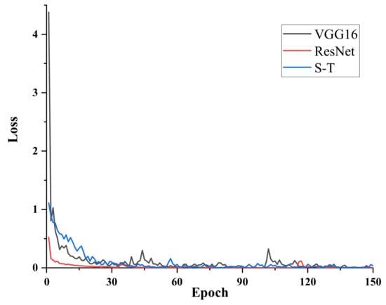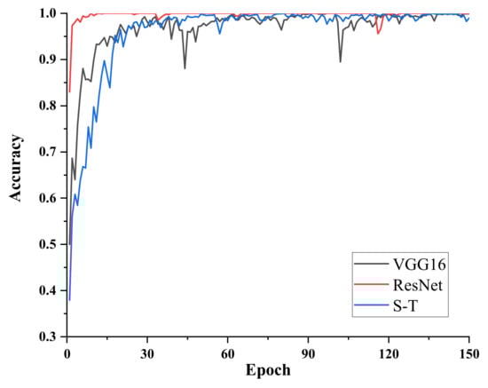Similarly, the bearing data set is randomly divided into training set and test set according to the ratio of 4:1, and three models of VGG16, ResNet and S-T are trained respectively by using the vibration images of the training set. The training parameter settings are shown in Table 5. After 150 epochs of training, the accuracy and loss of the training set model are shown in Figure 4 and Figure 5, respectively, from which it can be determined that the model training converges.