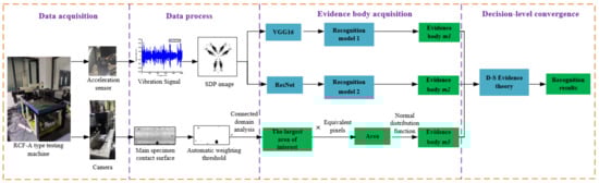 At present, the fusion theories mainly include D-S evidence theory, Bayesian theory, fuzzy set theory, rough set, etc. In comparison, D-S evidence theory can deal with the uncertainty caused by ignorance and can well characterize the uncertainty information []. Therefore, this paper chooses D-S evidence theory to perform decision-level fusion of state identification results from a single information source of vibration or image.
