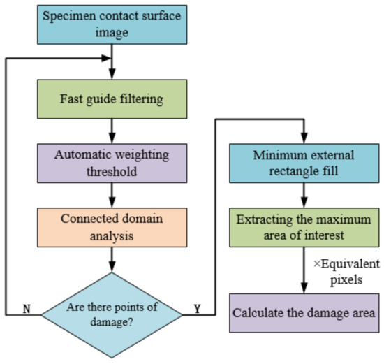 Figure 10 shows the defect area calculation process of specimen based on machine vision [,]. Firstly, the image is denoised by fast guided filtering. Secondly, the automatic weighted threshold method is used to perform threshold segmentation on the image. Thirdly, the connected domain analysis is carried out and the segmented maximum interesting area is located. Finally, the maximum interest area is obtained by filling the minimum circumscribed rectangle, and then multiplied by the corresponding equivalent pixel  [] to obtain the corresponding damage area.
