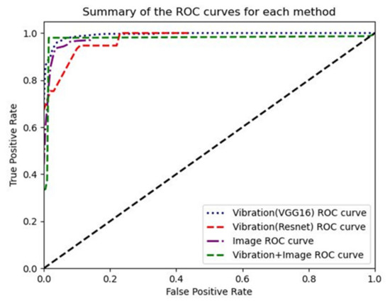 The validity of the method proposed in this paper is further verified by the ROC curve (Receiver Operating Characteristic Curve). The ROC curve takes each detection result as a possible recognition threshold, calculates the corresponding True Positive Rate (TPR) and False Positive Rate (FPR) as follows, and the curve drawn with FPR as the abscissa and TPR as the ordinate []. The ideal state should be TPR = 1, FPR = 0, that is, the (0,1) point in the figure. Therefore, the ROC curve should be as close as possible to the (0,1) point and deviate from the 45-degree diagonal.