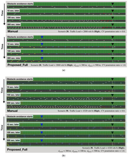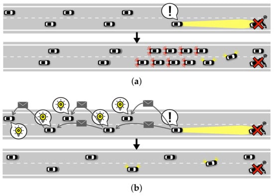 In recent years, safe driving support and automated driving technology using vehicle-to-vehicle (V2V) communication have been actively studied. The methods used in these studies are expected to improve the safety and efficiency of traffic flow because vehicles can cooperate by sharing their position, speed, and other driving information with surrounding vehicles [1]. If an obstacle (e.g., a disabled vehicle or spilled cargo) suddenly blocks part of a multilane road, a traffic jam may occur because of the decrease in the road capacity [2]. Even if the road capacity after the blockage is larger than the offered road traffic, traffic jams may occur because vehicles in the blocked lane need to move to the neighboring lane, which leads to the sudden deceleration of vehicles [3] as shown in Figure 1a. In this situation, if the vehicle that detected the obstacle immediately notifies the following vehicles of the obstacle’s position by using V2V communication, the following vehicles will be able to take action to avoid the obstacle in advance, thereby preventing a traffic jam, as shown in Figure 1b.