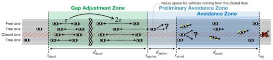 Each vehicle determines its behavior according to the distance between the position of the obstacle and its position x. To this end, we define zones before the obstacle, as shown in Figure 3. If a vehicle is in the lane that is closed by the obstacle (referred to as the closed lane) and the distance to the obstacle, d, satisfies (referred to as the avoidance zone), it attempts to change lanes. If a vehicle is in the lane where the obstacle does not exist (referred to as the free lane) and d satisfies (referred to as the preliminary avoidance zone), it attempts to change lanes. If d satisfies (referred to as the gap adjustment zone), a vehicle increases the time headway to make space to accommodate vehicles entering from the neighboring lane.