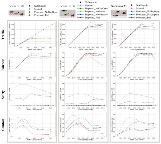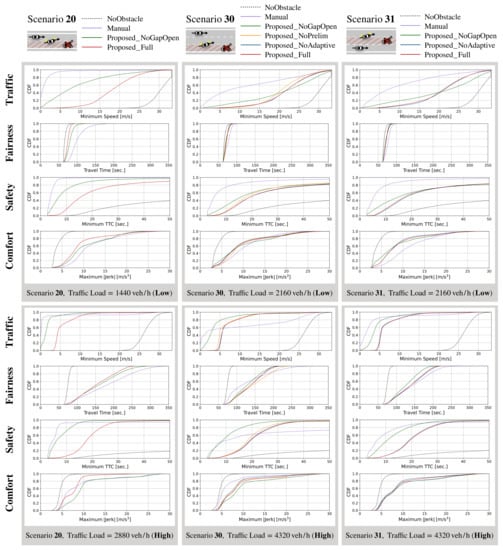 Proposed_Full: Proposed_Full achieves sufficiently high total traffic throughput in all scenarios. In addition, it achieves very high fairness, safety, and comfort level in all scenarios. However, it has lower traffic throughput than Proposed_NoGapOpen in Scenarios 30 and 31, but higher traffic throughput in Scenario 20. This is because the control of doubling the time headway of vehicles in all three lanes is excessive, resulting in lower traffic throughput. Thus, it is expected that as the ratio of closed lanes to the total roadway lanes becomes smaller, the control of doubling the time headway of all vehicles will become excessive, and a lower traffic throughput will result. There is thus room for improving our method in the future.