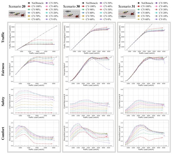 Overall, all metrics tend to become worse as the CV penetration ratio declines. However, traffic throughput and comfort level tend to improve above 50% the CV penetration ratio. These characteristics show that when the CV penetration is around 50%, obstacle avoidance is less smooth than when either CVs or NCVs are dominant. This can be explained as follows. As the CV penetration ratio becomes smaller, more vehicles in the closed lane have difficulty in completing a lane change, resulting in more frequent rapid deceleration and traffic jams around the obstacle, thereby degrading the traffic throughput and comfort level. On the other hand, as the CV penetration ratio becomes smaller, that is, as more vehicles do not adjust their time headway, they tend to maintain a high speed, and, thus, the traffic throughput increases. Even if some vehicles have a high discomfort level, if many vehicles overtake the obstacle at high speed, the average discomfort will be low. As a result of these two phenomena, as the CV penetration ratio approaches 50%, traffic throughput and comfort level deteriorate.