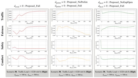 Preliminary avoidance zone: If a vehicle in the closed lane and a vehicle in a free lane begin attempting to change lanes at the same point in time, the vehicle in the closed lane may be able to change lanes faster than the vehicle in the free lane. In this case, the vehicle density in the free lane temporarily increases, and vehicles in the free lane will be forced to decelerate. Therefore, the size of the preliminary avoidance zone () should be sufficient to shift the lane-change timings for vehicles in the closed lane and the lane change timing for vehicles in the free lane. Simulation results show that traffic throughput improves when . However, the fairness and comfort level deteriorate when . This result can be explained as follows. If the size of the preliminary avoidance zone is too large, there is too much of a time lag between the lane change of the vehicle in the free lane and the lane change of the vehicle in the closed lane, and the following vehicle accelerates to shorten the long inter-vehicular gap made by the lane changes of the vehicles in the free lane. As a result, when the vehicle in the closed lane starts to change lanes, there will be insufficient space for it to change lanes smoothly, and the vehicles need to decelerate. Thus, the fairness of the traffic throughput and comfort level deteriorate with frequent deceleration in the lane next to the closed one. Consequently, we can conclude that a suitable size of the preliminary avoidance zone is 30–100 m.