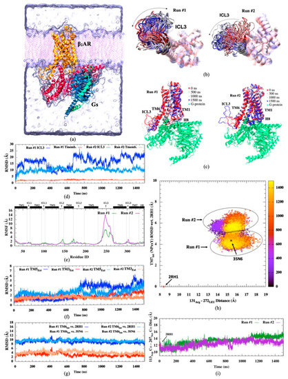 Two independent 1.5 μs long MD simulations were conducted on the apo form of the active state of human β2AR in a complex with a Gs protein. Throughout both trajectories, the active state of the receptor was well preserved with the characteristic tilt in transmembrane helix 6 and ICL3 towards the lipid bilayer to give Gs full access to the binding cavity at the intracellular part. On the extracellular part, since no ligand was attached at the orthosteric site, a minor expansion was observed because of the slightly distancing motion of TM5 from TM3. However, this slight conformational shift at the extracellular part did not cause any allosteric interference in the intracellular region.