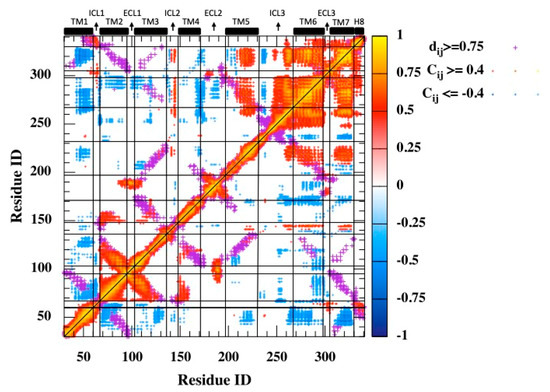 Figure 3a, mutual information was plotted together with a contact map to unravel the long-distance coupled motions of the allosteric network (see magenta dots). However, the only significant correspondence in distant Cα fluctuations was detected between a few residues located in ICL3’s midpoint and the distant extracellular parts of TM6, extracellular loop 3 (ECL3), and TM7, which incorporate critical orthosteric binding site residues such as