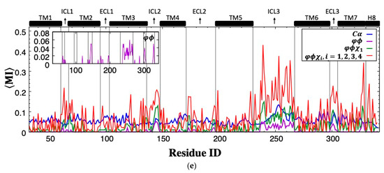 Figure 3d,e, the increasing trend in MI values between ICL3 and ICL2 was noticeable. Maximum MI reached a value of 6.55. In addition, ICL3 started to share information with the majority of the receptor, including mainly loop regions such as ICL1, ICL2 at the intracellular part, two ends of the extracellular loop ECL2, the entire ECL3, and also the intracellular part of TM7 with its adjacent tail H8. Overall, it is clear that mutual correspondence driven by torsional degrees of freedom mainly existed between loop regions.