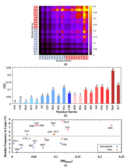 Figure 4c, the frequency of a residue type in loop regions is slightly proportional to its average shared MI. Almost all polar residues indicated with red dots displayed frequency values above 5%, which represents the random occurrence, whereas only three hydrophobic residues,