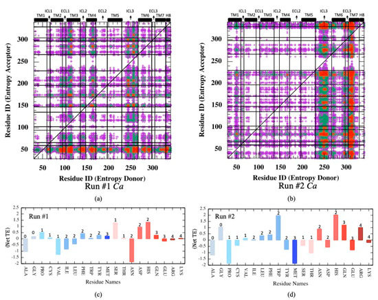Figure 6b, the same loop regions still appeared as entropy donor sites with an increased intensity dominating the future fluctuations of torsional angles everywhere in the receptor. In addition, maximum TE values reached 26.46 and 31.54 in two runs.