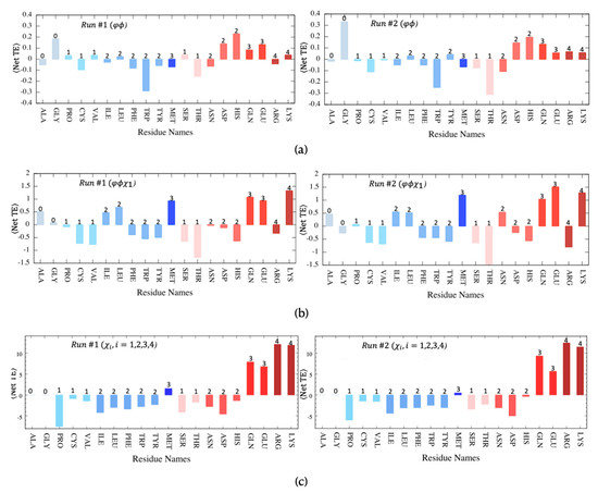 Figure 7, using a bar plot to display the average net transfer entropy where the entropy source (donor) and sink (acceptor) residues can be identified by their positive and negative values, respectively. Corresponding plots that display net transfer entropy for a pair of residue types such as entropy donor versus entropy acceptor are provided in