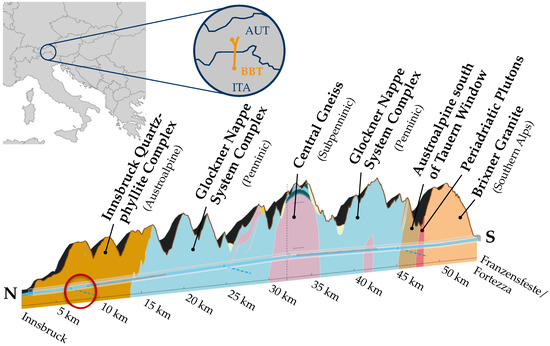 Geology of the Brenner Base Tunnel (BBT) from Innsbruck (left) to Franzensfeste/Fortezza (right) and location (red circle) of the considered stretch (adapted with permission from Ref. [45], 2019, BBT SE).