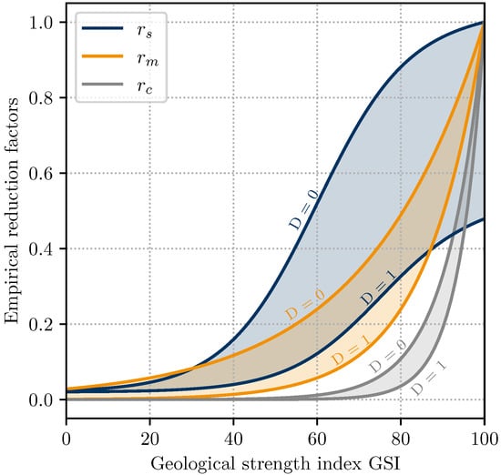 in terms of the geological strength index GSI and the disturbance factor D. In Figure 3, the influence of GSI and D on the empirical reduction factors, defined by (4), (10) and (11), is depicted.