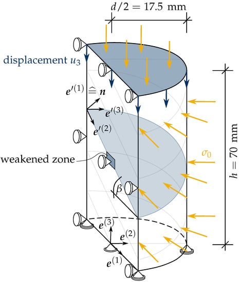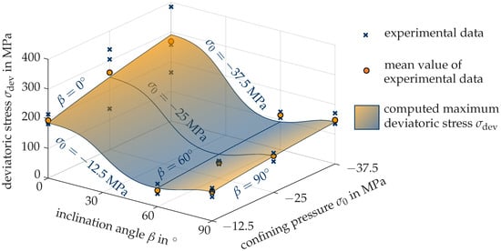 In the following, the material parameters of the TI-RDP model are calibrated for Innsbruck quartz-phyllite based on experimental results of triaxial compression tests performed by Blümel [51] on specimens sampled from a construction site of the Brenner Base Tunnel. The eccentricity parameter e in (9) cannot be calibrated by triaxial compression tests. It is assumed as as recommended in [50]. In the experimental study, tests with three different confining pressures 12.5 MPa, 25 MPa and 37.5 MPa and three different directions of axial loading with respect to the inclination of the foliation planes, i.e., , and , were carried out. The cylindrical specimens with a height of 70 mm and a diameter of 35 mm were tested in a displacement controlled manner by monotonically increasing the axial displacement at the top surface of the specimens.