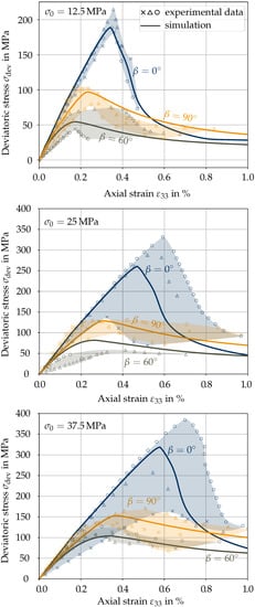 Figure 6 shows the computed deviatoric stress-strain curves of the triaxial compression tests together with the corresponding results from the experiments by Blümel [51]. Despite of the large scatter of the experimental results, for the considered confining pressures of MPa, 25 MPa and MPa and inclination angles of the foliation planes , and , the numerically predicted strength exhibits good agreement with the corresponding mean values of the experimentally determined strengths.