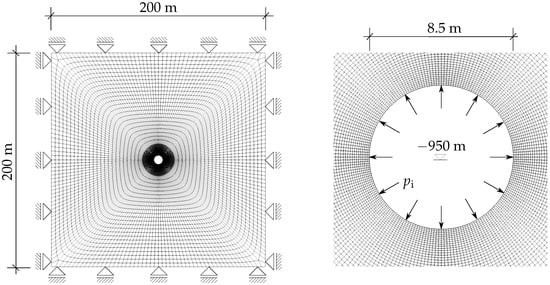 The finite element mesh together with the initial and boundary conditions is illustrated in Figure 8. The tunnel profile is characterized by a circular cross section with a diameter of m and an overburden of 950 m at the tunnel axis. To ensure a negligible influence of the boundary conditions (cf. Figure 8 left) on the stress distribution in the vicinity of the tunnel, the considered area of the surrounding rock mass is chosen as 200 m × 200 m.