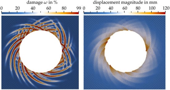 Figure 9 shows the distribution of the damage variable (left) and the displacement magnitude (right) in the final stage of the simulation before failure, i.e., for a release of the surface pressure of 97.5%. Due to the excavation, for a release of the surface pressure exceeding ∼90%, the rock mass is subjected to softening, which leads to localization of strains into multiple distinct shear bands, cf. Figure 9 left. In the simulation, strain localization is triggered by the weakened elements, mentioned in Section 4, breaking the otherwise expected axisymmetric behavior. A similar shape of the damage pattern was observed in experiments performed, for example, by Papamichos et al. [54] or Meier et al. [55].