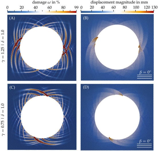 In Figure 10C,D the damage distribution and displacement pattern are shown for , resulting in a lower value for compared to . Compared to the side walls, this results in a concentration of the highly damaged zones and consequently larger displacements at the top and the bottom of the tunnel cross section. Here the surface pressure at the excavation boundary acts in the direction perpendicular to the foliation planes.