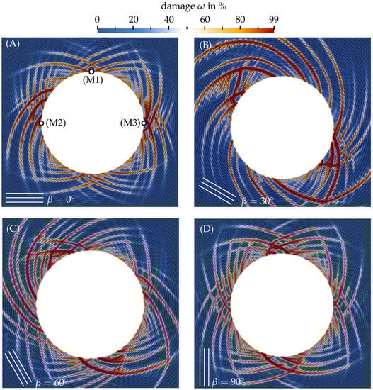 In Figure 12, the distribution of the damage variable is shown for the four inclination angles in the final stage of the simulation before failure at a release of the surface pressure of 97.5%. It can be seen that the failure pattern, manifested by the distribution of the highly damaged zones, strongly depends on the inclination angle of the layered rock mass. Considering the mechanical properties of Innsbruck quartz-phyllite, cf. Table 1 (, , ), it can sustain higher loads for loading perpendicular to the foliation planes compared to loading parallel to the foliation planes. Thus, the highly damaged zones are localized where the predominant loading direction, i.e., the direction of the acting surface pressure, is aligned with the foliation planes (cf. Figure 12A–D). Note that for the present axisymmetric tunnel geometry and the hydrostatic initial geostatic stress, the damage patterns for the different inclinations of the foliation planes are not only obtained by a rotation around the tunnel center but are also slightly affected by the randomly distributed weakened zones.