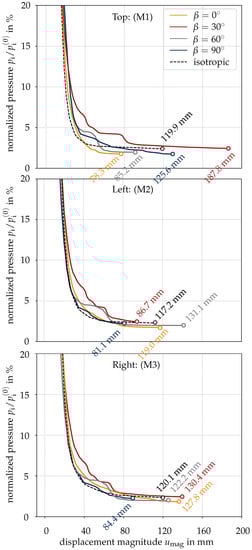 As a benchmark for assessing the influence of the anisotropy parameters and serves the simulation with the isotropic RDP model. For the latter, the parameters , and the isotropic elastic stiffness tensor in the stress-strain relation (1) with a Young’s modulus of 45,000 MPa, a Poisson’s ratio of and a shear modulus of are employed.