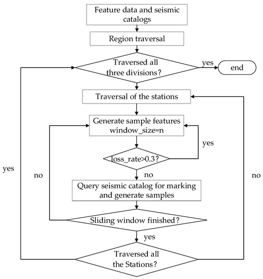 Earthquake-prediction models are built in each of the three regions with the sample matrices obtained by sliding windows [33]. The step of the sliding window is set to 1 day, all features are arranged in time sequence by day, and the one-dimensional sequence sample set can be generated along the time dimension according to this sliding window. In order to enhance the robustness of the data, this paper checks the data loss rate for each sliding window matrix, and if the loss rate > 0.3, this sample is to be discarded. The loss rate is chosen as 0.3, which is an experimental result. This paper tried to use 0.1~0.5 as the threshold, the step size of which was set to 0.05. The amount of data was sufficient and the validation set obtained was good enough when 0.3 was chosen as the threshold. Figure 2 shows the regional sample composition process.