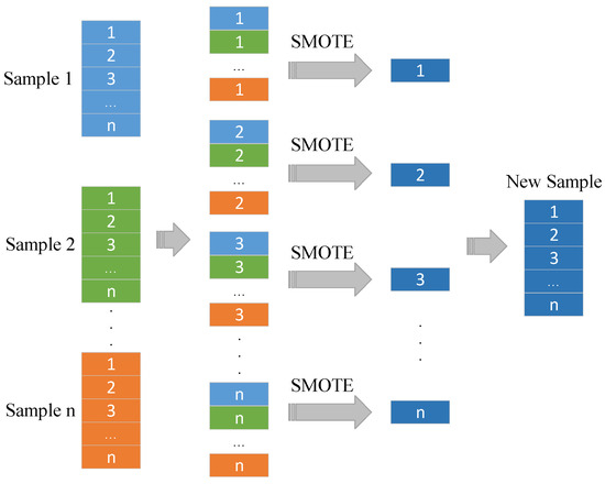 To generate new samples by algorithm synthesis, SMOTE iterates through the sparse number of unbalanced samples, calculates the distance of each sample x from all the remaining samples, and gets the k samples closest to it. Then, according to the imbalance ratio of positive and negative samples, some samples are randomly selected from the obtained k samples to be added to the original sample. Finally, a new sample is generated based on each selected sample and the original sample x [35]. The equation is as follows: