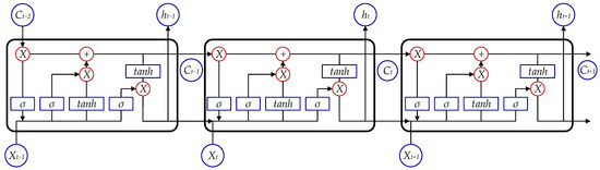 LSTM is a time series network that takes the previous output and the current input as the input for the next time, thus allowing the model to take into account historical or future information of the data when performing prediction tasks. Compared with the traditional time-series model RNN, LSTM incorporates the concept of “gates”, which is used to solve the problem of retaining long sequences of historical information and long-range gradient transfer. To be specific, LSTM introduces cell states, input gates, forgetting gates, and output gates, which are used for storing information about historical data, inputting current and historical information, controlling the information that needs to be forgotten, and output predicted results, respectively. The schematic diagram of LSTM network architecture is shown in Figure 4.