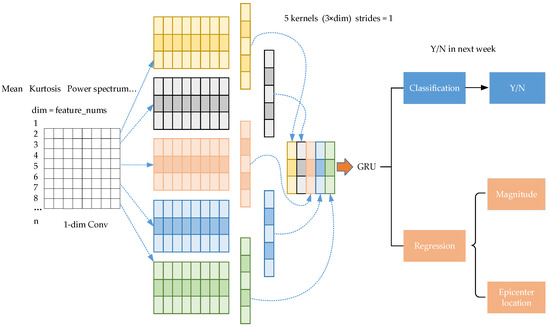 After that, the data extracted by multiple convolutional kernels are stitched horizontally to form a new two-dimensional anomaly data matrix. Finally, it is input to the GRU temporal network for classification or regression tasks. The overall architecture of the model is shown in Figure 7.
