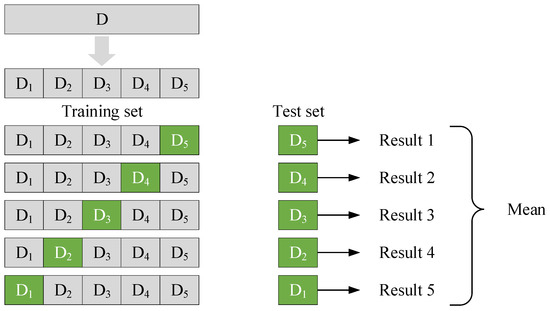 In addition, the cross-validation method is used to increase the robustness of the model [44], which can make the results more convincing by dividing the total sample into k mutually exclusive subsets and being trained accordingly. Figure 8 shows the schematic diagram of the five-fold cross-validation.