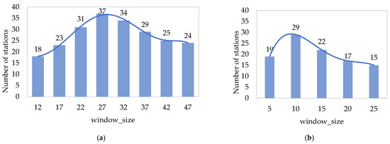 Taking the processing of electromagnetic signals as an example, in this paper, eight control experiments were done for the sliding window time scale parameter with an interval of 5 days each time. This paper verifies the effect of the model and counts the number of stations with an AUC index greater than 0.65. It is obvious that the effect of the model increases at first but decreases as the time scale of the sliding window becomes longer. It achieves the best effect in the time range of [24 days, 30 days], and finally the sliding window size is set to 27 days for electromagnetic signals according to the results in Figure 9a. Similarly, the sliding window size is determined to be 10 days for the geoacoustic signals as shown in Figure 9b.