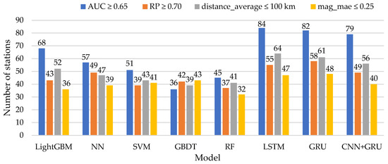 This paper compares the effects of the models based on the four indicators: AUC, RP, , and . To be specific, the AUC metric represents the overall performance of the model for earthquake prediction, including correct prediction, false prediction, and missed prediction. The RP measures the recall of earthquake prediction and its expression is the same as TPR. The distance_average and mag_mae evaluate the deviation of epicenter and magnitude prediction, respectively. The higher the number of stations in the same index, the better the model effect is indicated.