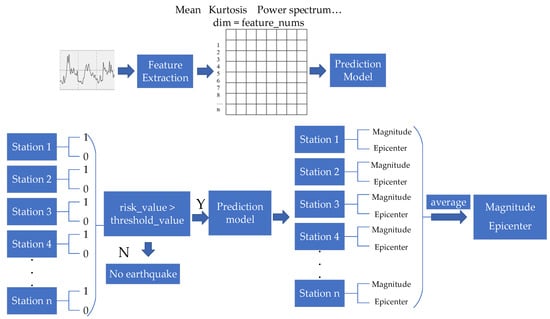where is the result of earthquake prediction, and is the earthquake prediction model; is the prediction result of magnitude and epicenter location, and is the corresponding prediction model, represents the input feature data, and , , represent the predicted magnitude, and epicenter latitude and longitude, respectively.