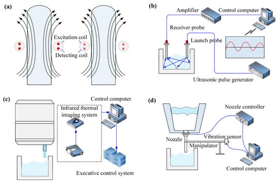 A number of flow state detection technologies, including electromagnetic detection [], infrared detection [,,], ultrasonic detection [], and vibration detection [,,,], have been developed to overcome the aforementioned issues. Figure 1 shows the essential functioning concepts: (1) The electromagnetic detection method works on the idea of installing a transmitting and receiving coil on the container’s wall and using the different permeabilities of the fluid and solid to detect the flow status []. This method, which has nothing to do with the nozzle valve opening, can see the amount of solid content in the fluid in real time. It has a high success rate and a quick response time, but it has various drawbacks in the detecting process, including a high price, a short service life, a complicated installation, and a high maintenance cost. (2) The infrared detection approach is based on pointing an infrared camera at a fluid and detecting it by comparing the thermal radiation properties of the fluid and the solid in the infrared frequency range []. The technology collects and processes a real-time image of the draining process using a contactless infrared camera. Visualization, vividness, and excellent reliability are all advantages. Due to the high temperature and severe environment, the infrared detection system can only collect a limited number of visible signals at the equipment entrance and is only utilized as a backup to other detection methods. The detection is always delayed, and it can only be noticed when a particular quantity of solid is incorporated into the fluid, limiting the precision and dependability. (3) The ultrasonic detection technique works based on the difference in ultrasonic reflected signals between pure fluid and mixed fluid to determine the solid content in the drainage process []. Like the infrared and electromagnetic methods, this approach is a posterior detection. It has various flaws, such as a low detecting accuracy and being damaged easily. (4) The concept of the vibration detection method is that when the nozzle pipe and the linked operational arm are subjected to fluid impact during the drainage process they will produce a specified range of vibrations. The flow is greater and the vibration is stronger when the nozzle opening is larger. Hence, the difference in fluid-induced vibration is employed [,,]. It belongs to the prior detection category and has the following benefits: long service life, high operating stability, cheap production cost, and simple installation and maintenance.