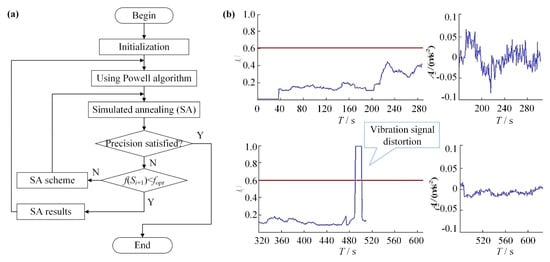Recognition of vortex sucking slag based on SA–ANN algorithm. (a) Algorithm implementation. (b) Vibration signal distortion feature. (Reprinted with permission from Ref. []. 2013, IEEE).