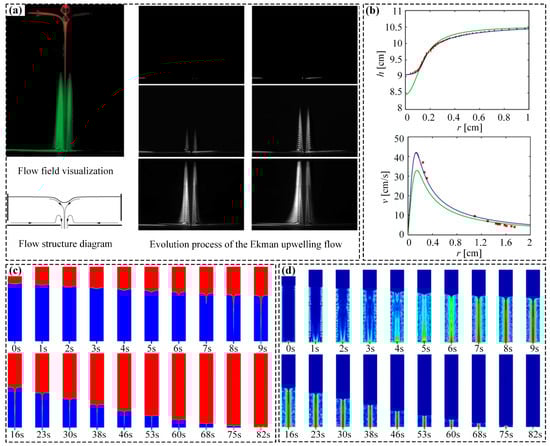 In recent years, Tan et al. set up a gas–liquid two-phase vortex dynamics model and discussed the internal relationship between the initial velocity component and the Ekman boundary layer. The results revealed that when the initial disturbance velocity is different, the vortex’s suction hole is consistent with the liquid level at the bottom of the container, as illustrated in Figure 8a. However, the thickness and critical height of the Ekman layer rise as the circumferential velocity increases. Then, as shown in Figure 8c, the vorticity evolution process of the flow field and particle at the suction and extraction stages was investigated, and it was found that a turbulent energy transition happens in this process []. Kim et al. [] studied the characters of free–surface vortex formation processes in a self-ingested reactor, as shown in Figure 8b, and found that the Ekman layer affects the bubble flow and the separation process of the eddy vortex. The presence of the Ekman boundary layer influences vortex generation significantly. The mechanism of the Ekman boundary layer on vortex generation has only been examined qualitatively in previous research. They still did not have a good grasp of the intrinsic link between local vortex development and the Ekman number.