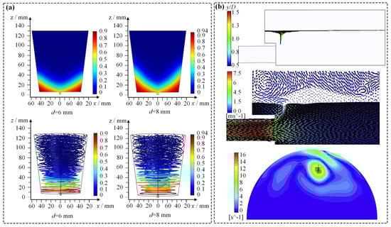 Interface evolution of a two-phase vortex. (a) Vortex evolution with different nozzle diameters. Reproduced with the permission of the General Iron and Steel Research Institute. (Reprinted with permission from Ref. []. 2017, Springer Nature). (b) Vortex core, flow model, and vorticity distribution of the flow field. Reproduced with the permission of Elsevier. (Reprinted/adapted with permission from Ref. []. 2017, Elsevier).