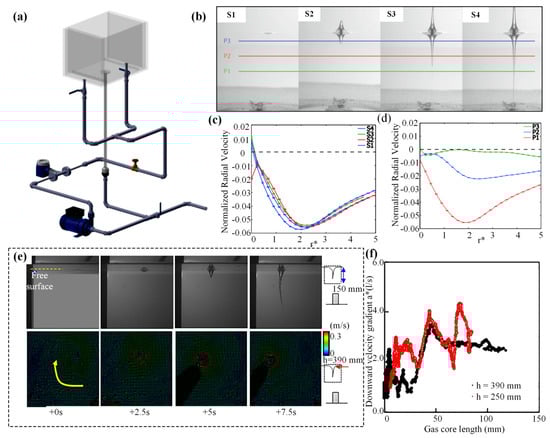 Flow characters of free sink vortex over time. (a) Experimental apparatus of gas entrainment. (b) Different development stages. (c) Normalized radial velocity of section P1. (d) Normalized radial velocity of stage S1. (Reprinted with permission from Ref. []. 2016, Elsevier). (e) Velocity distribution in the intermediate plane. (f) Relationship between the downward velocity gradient and the gas core length. (Reprinted with permission from Refs. [,]. 2019, Elsevier).