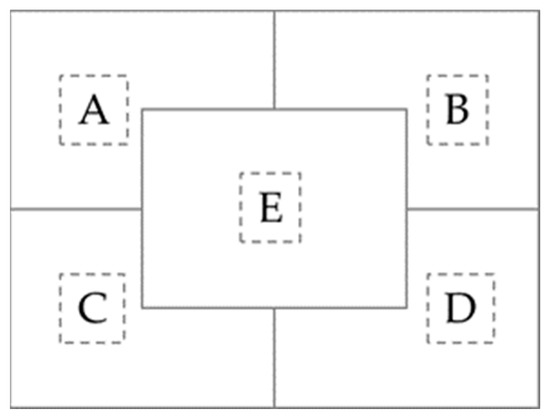 Random point selection is a key part in this process. We adopted a uniform random sampling method for the image plane. First, the image plane was evenly divided into 2 × 2 grids, and each rectangle covered exactly one-quarter of the image. Thereafter, a region of equal size was placed at the center of the image, and the image plane was divided into regions named from A to E, as shown in Figure 2. During sampling, five points were randomly selected from these five regions.