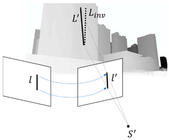 For the calculation of , the vertical line segment is mapped to the virtual perspective image by the feature mapping results, and then the vertical line segment in the image is mapped to the 3D model space according to the spatial relationship between the virtual and real images, as shown in Figure 3, to obtain the 3D vertical line segment. The error of the vertical line segment in 3D model space is used as a constraint, and its error is calculated by: