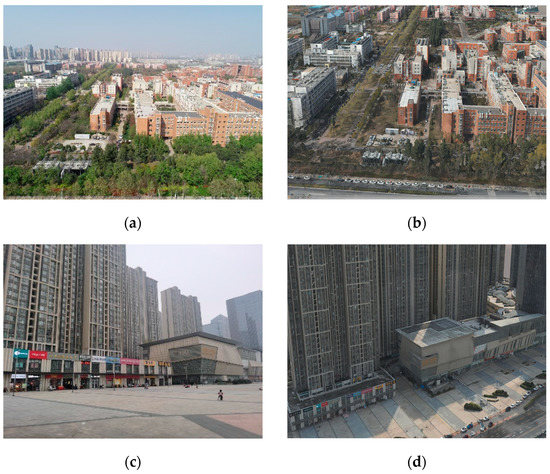 We used images captured using a smartphone in the 2D-3D registration experiment. A Huawei Meta 30 smartphone was used because it has built-in general-purpose GPS and geomagnetic sensors, which were necessary for this experiment. Two photos were used as real images for the experiment, named P1 (Figure 4a) and P2 (Figure 4c), which were taken in September 2021. The estimated and actual poses are presented in Table 1, and the coordinates are described by the ECEF coordinate system. The estimated pose was obtained using the CamPOS application. CamPOS is an image acquisition program developed in this study. While shooting photos, it can acquire GPS and geomagnetic sensor information without redundant optimization processing. The virtual digital twin scenes (Figure 4b,d) are oblique photography 3D models generated from UAV aerial images. The images were captured in December 2020. Because of the difference in seasons and time, the texture of the virtual scene 3D model was different from the appearance of the test image, which increased the difficulty of image matching.