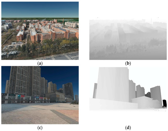 According to the proposed method, the Cesium digital earth platform was used as the 3D GIS system in the application of the digital twin city, and the virtual perspective and inverse depth maps of the digital twin city model were generated according to the estimated pose, as shown in Figure 5. The perspective image was matched with the real image, and 3D coordinates for the feature points were obtained from the inverse depth image.