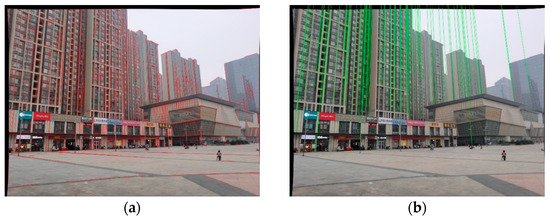 EDLines was used to extract the line feature of the image. According to the direction of gravitational acceleration, the candidate plumb line set was obtained: set = 0.5, = 105. The vanishing point was calculated by the two-line MSS method, and the plumb line was extracted. The experimental results are shown in Figure 6.