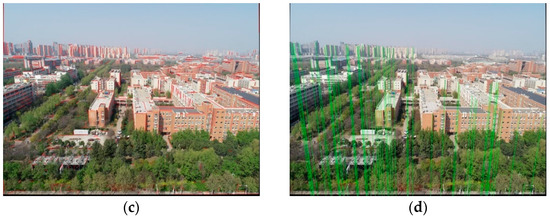 The results show that the camera pose estimated by using the traditional point feature matching method (SuperGlue and GMS) has a larger vertical error because the Z-coordinate error is larger than the X, Y coordinate error, and the pitch angle error is larger than the yaw and rolling angle error. This is because real images contain sky, trees, and barren ground, resulting in an uneven vertical distribution of feature points in the image. It can also be seen in Figure 7 and Figure 8 that in the image matching results, there are more feature points in the middle of the image, while there are fewer feature points in the upper and lower parts. This leads to insufficient constraints in the vertical direction, resulting in a large vertical error. In Trials 1-2, because this method uses the structural semantic information in the image and the direction of the plumb line to constrain, the error in the vertical direction is significantly reduced. Comparing Trials 4-5, our IDSSC-MP method obtains better results when the same feature point extraction algorithm is used. In Trials 4-5, the average error of the Z-coordinate is 5.26 m, but 2.88 m in Trials 1-2, which is 45% less than that in Trials 4-5. In Trials 1-2, the accuracy of the NCM and RMS is also higher, and the calculated camera position and attitude errors are smaller, which shows the effectiveness of the MP-IDSSC method.