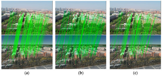 To improve the efficiency and accuracy of the algorithm, this study adopted the cross-validation method of a dynamic adaptive threshold based on the selected initial value. The fast library for approximate nearest neighbors (FLANN) algorithm was used to seek the matching point pairs for screening, which generally included a first matching point with the closest Euclidean distance and a second matching point with the second closest Euclidean distance. It is generally believed that, for a certain matching point pair to be screened, the smaller the distance of the closest matching point compared with the distance of the second closest matching point, the better the matching quality. Traditional algorithms generally use a fixed scale factor as the threshold. In particular, when is satisfied, the matching point pair is used as a candidate. However, because of the radiation difference, the distribution range of the Euclidean distance difference between point features is unpredictable, and it is generally necessary to manually adjust the threshold to select a better matching point pair. To solve this problem, we designed a cross-validation method for a dynamic adaptive threshold. First, the FLANN cross-nearest neighbor search was used to calculate the average distance difference between the closest and second closest matching point in the cross search.