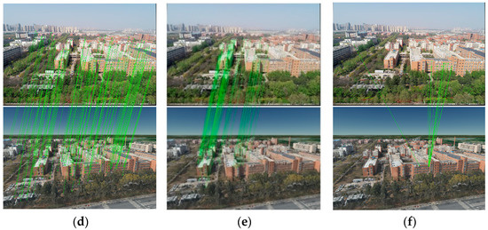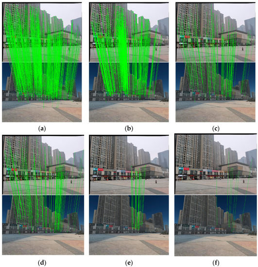 Results of image matching experiment result of image P2: (a–f) results of Trails 1-6. Green lines indicate correct matches when considering a threshold value of 2 pixels. The feature points are unevenly distributed in the vertical direction.