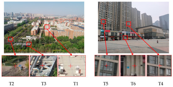 Table 4 lists the basic information for each target point, and Table 5 lists the different experimental results obtained. In the target point information, target distance (TD) refers to the distance between the target point and the camera in meters, and radial distance (RD) refers to the radial distance of the target point on the image from the principal point in pixels. Base coordinates (BC) refer to the coordinates of the target point in the base geographic data, which are used to evaluate the errors of the coordinates of the target point calculated in different trials. The evaluation index includes the position error (PE), absolute position error (APE), and relative position error (RPE). The PE refers to the error of the target point in the ECEF system. The is the L2 distance of the PE. The RPE is the relative error calculated using .