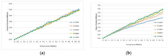 The impact of the parameters in Table 5 on registration accuracy requires in-depth analysis. The literature [35,36,37] has analyzed and performed experiments on parameters such as image distortion and camera pose. Hence, we adopted the Monte Carlo [38] method to analyze the impact of virtual scene errors on camera positioning and object positioning accuracy. The Monte Carlo method, also known as the stochastic simulation method, uses computers to generate qualified random data that can replace data that are difficult to obtain in experiments. Figure 11a shows the relationship between virtual scene data errors and calculated camera position root mean square (RMS) errors when the camera distance D is from 100 m to 500 m. Taking the center point of the image as the object position, Figure 11b describes the relationship between the RMS object position error and the virtual scene data error.