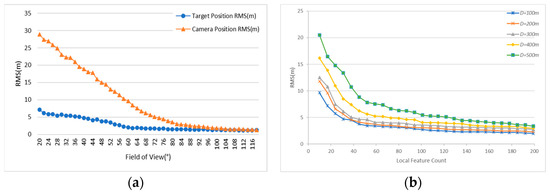 Figure 12 illustrates the impact of the field of view and feature count on the calculation accuracy of the camera pose and target position. The results show that when the field of view increases, the camera position error and target position error gradually decrease and that the field of view has a greater impact on the accuracy of the camera position. The feature count also has an impact on the target localization results. We used random sampling to uniformly select different numbers of feature points from an image for comparative experiments. The figure shows that when the feature count decreases, the RMS error of target localization increases continuously. Notably, when the feature count is less than 50, the RMS error of localization greatly increases.