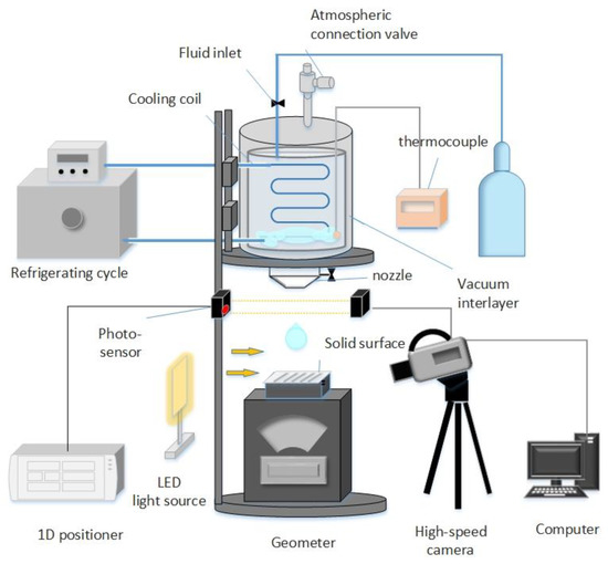 As shown in Figure 1, the experimental system was set on a level optical platform to guarantee vertical impingement. It includes a droplet generating system, a one-dimensional positioner, an image acquisition system, and solid surfaces. Among them, the droplet generating system includes an insulated tank with thermostatic water bath circulation and a detachable nozzle with an inner diameter of 2 mm. The temperature in the tank is monitored in real-time by thermocouples and a data acquisition system. The insulated tank moves in the vertical direction to change the impinging height of the droplet in free fall and droplet impingement velocity. The adjustment range of height is 0–50 cm. In the experiment, the backlight photography method was adopted, and the data were collected by an image acquisition system, including a background light source (LED), photoelectric sensor, computer, and a high-speed camera (FASTCAM SA-Z, Photron, Tokyo, Japan) with a shooting rate of 20,000 fps and a resolution of 1024 × 1024. In order to preserve the R1336mzz(Z) in liquid and control the experimental variables as much as possible, the temperature of the water bath was controlled at 0 °C. The temperature of R1336mzz(Z) was maintained at 5 ± 1 °C accordingly, considering the heat dissipation of the tank and pipe. The properties of R1336mzz(Z) at 5 °C are listed in Table 1. The experiment was conducted at room temperature (20 ± 3 °C) and atmospheric pressure.